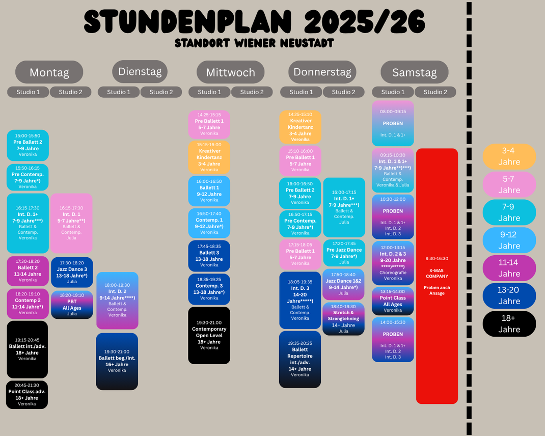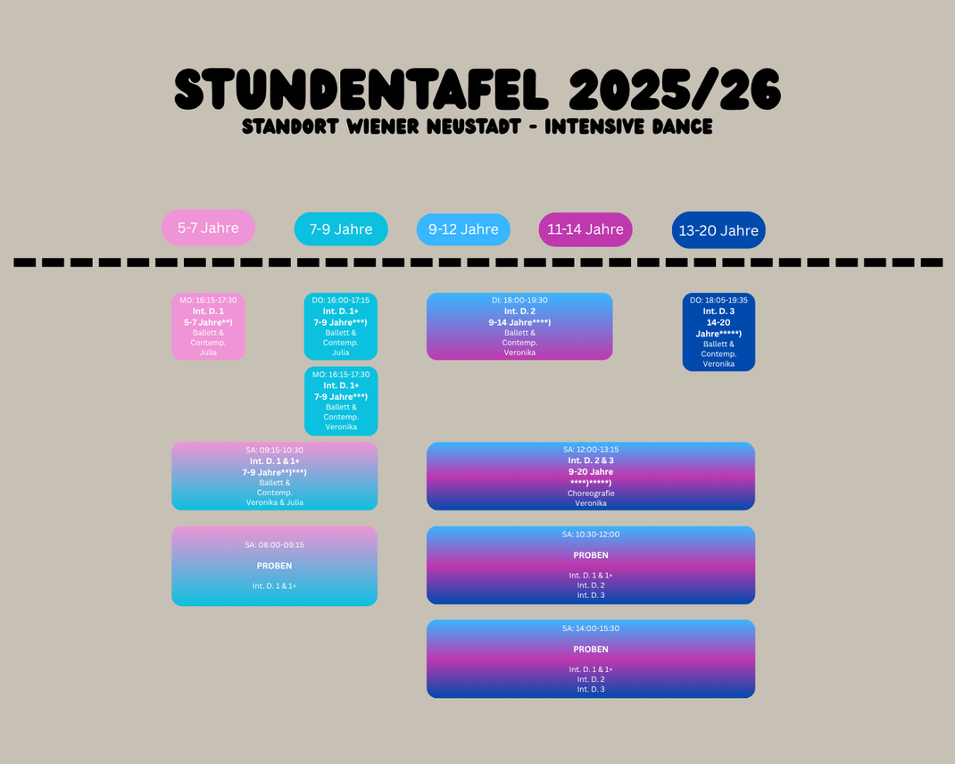 **) Intensive Dance 1+ = 225 Minuten pro Woche: 2x75 Minuten Training/Probe
